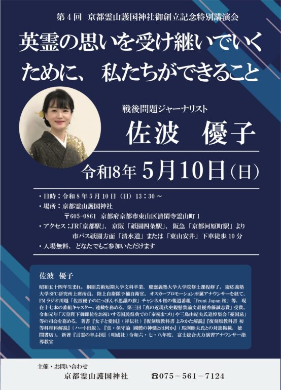 京都霊山護国神社創立記念にあたる5月に特別講演会を開催いたします。